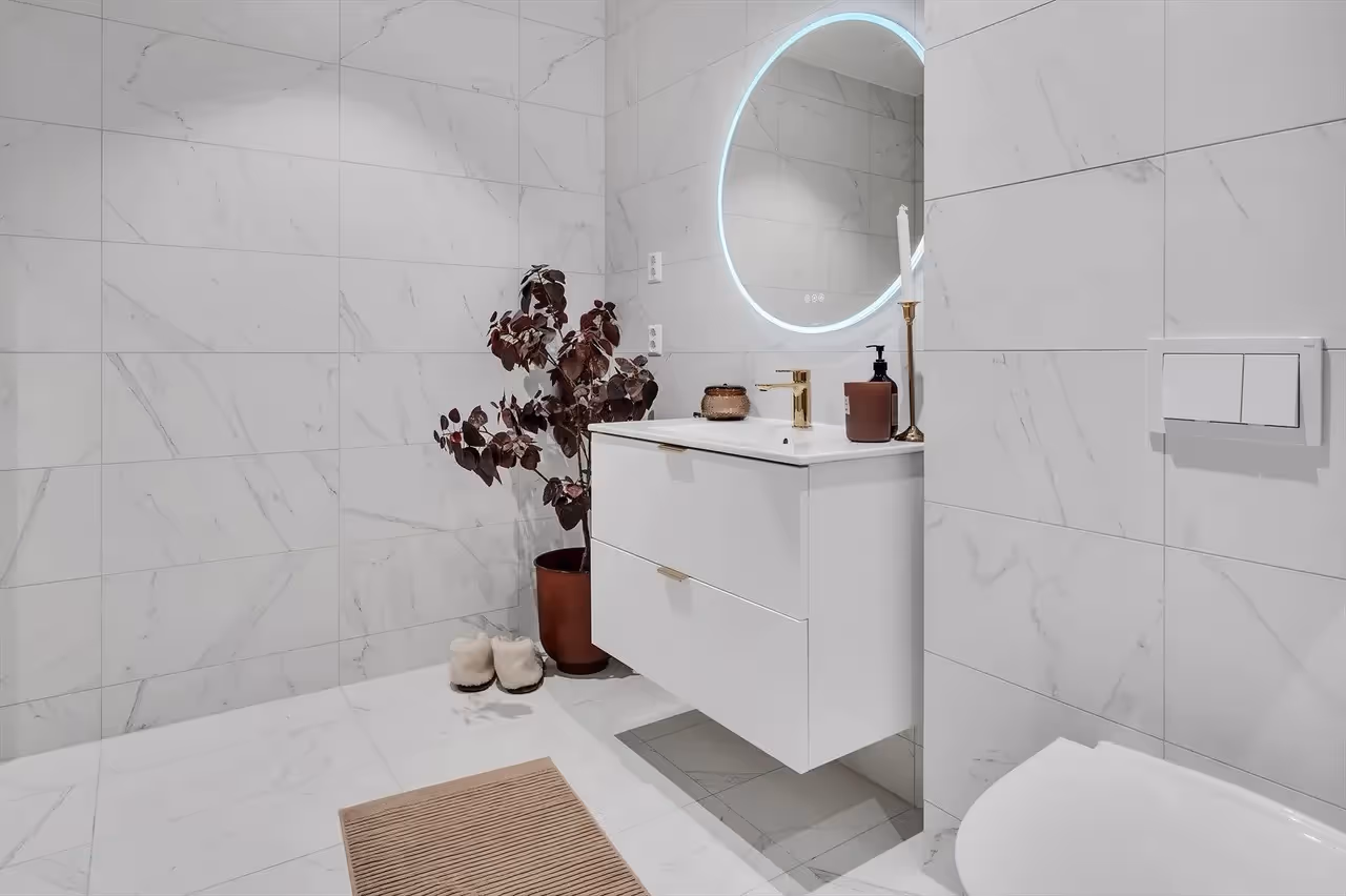 Leiligheten fremstår som svært moderne og stilren med behagelige fargevalg. Gjennomgående smart planløsning, samt lekre detaljer. Leiligheten har en lys og romslig stue, med åpen kjøkkenløsning fra Strai, to delikate baderom, to gode soverom og en pen entre. Praktisk bod i kjeller med god plass for oppbevaring. Utvendig er det en takterrasse og en privat terrasse ut fra hovedsoverommet og kjøkkenet. Begge solrike med flott plass til utemøbler.
